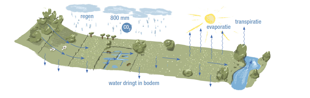 Jaarlijks valt er zo’n 800 mm regen, dat komt overeen met 800 l/m2 per jaar. Dat is een hele hoop water, en dat moet ergens naartoe. Een eerste mogelijkheid is dat het oppervlakkig afstroomt. Dat zal vooral gebeuren op harde oppervlakken zoals parkings, beton, daken enzovoort. Maar ook akkers, waar zware machines op gereden hebben, laten geen water meer door. Hier zal het water afstromen in grote hoeveelheden, eventueel via een woonwijk in een beek terechtkomen en tenslotte via de rivier afgevoerd worden naar zee. Je kan zo'n rivier dan hogere dijken geven, maar daarmee los je het probleem van overtollig water dat afstroomt niet op. Een rivier kan die grote hoeveelheden niet aan. Het is daarom belangrijk dat een deel van dat water onderweg verwerkt wordt. Afstromend oppervlaktewater neemt onderweg voedingsstoffen op en is dus een bron van water dat vrij rijk is in termen van voedselhoeveelheid: voedselrijk water dus.